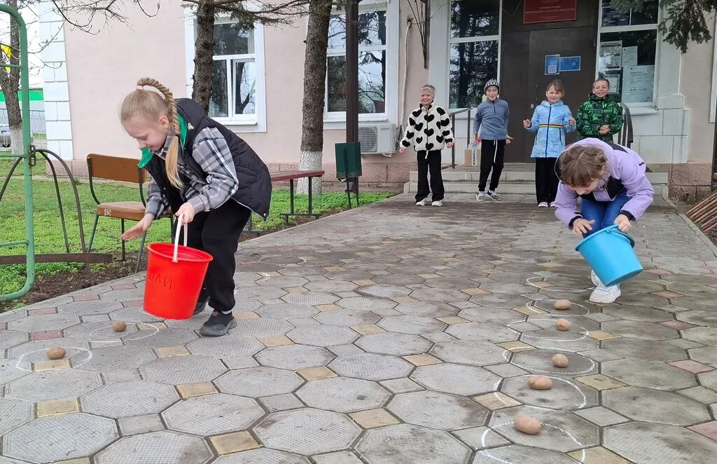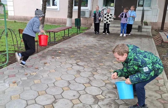 🥔 Белорусская «Бульба» – тут без картошки никуда! Команды строятся, у первых игроков – ведерки с картофелем. Нужно добежать до кружочков, «посадить» по одной картошке в каждую лунку, вернуться. Следующие игроки бегут «собирать урожай». Кто быстрее посадит и соберёт – тот и молодец!