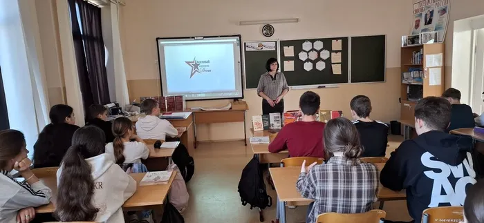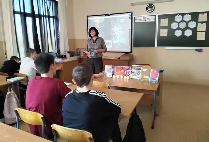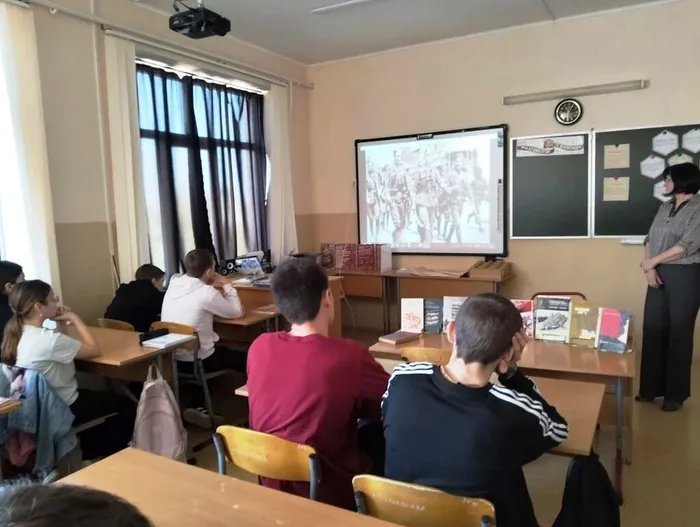 Библиотекарь познакомила старшеклассников с книгами, которые хранят свидетельства тех страшных лет. Одной из них стала документальная повесть Генриха Гофмана «Герои Таганрога», созданная на основе архивных документов и воспоминаний очевидцев. Она посвящена героической борьбе таганрогского подполья в годы оккупации-.